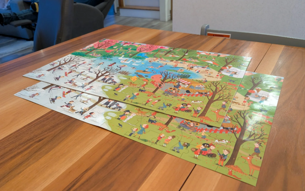 - L'endos des pièces est marqué par 3 couleurs : les 4 coins en orange, le contour en bleu pâle et les pièces du centre en rouge. Une belle façon d'ajouter une activité de catégorisation par couleurs et de compréhension des étapes de réalisation.